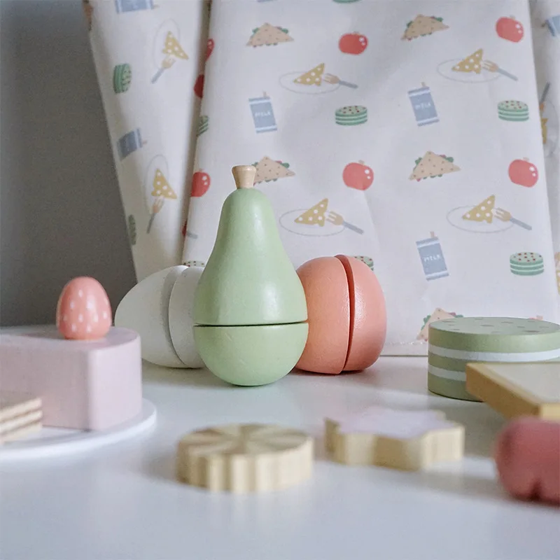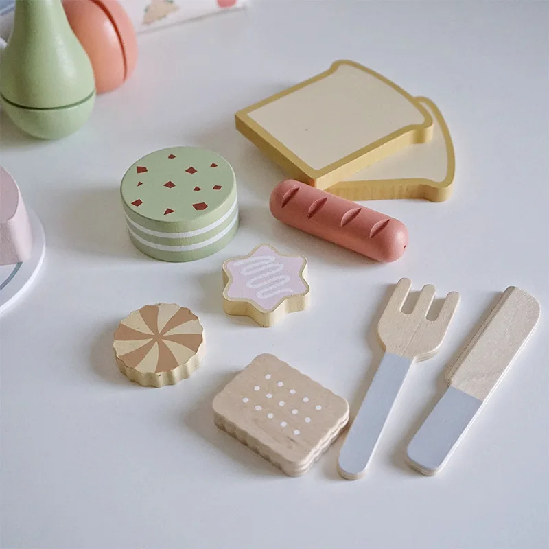 Kids Wooden Picnic Play Set with Pretend Food Fruit Dessert Bread and Kitchenware for Fun Parent Child Interaction Learning